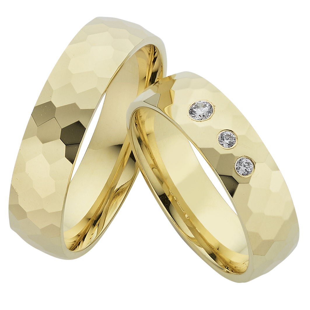 Der einfarbige TRAURINGWUNDER-Ring TWTL 16 ist komplett in Gelbgold Hochglanz gehämmert und hat eine Breite von 5,5mm und eine Höhe von 1,6mm. Der wunderschöne Damenring besticht durch 3 Brillanten mittig eingerieben nebeneinander mit Abstand eingefasst, mit einem äußeren etwas größeren Brillanten mit einer Gesamtsteingröße von 0,09 carat in der Qualität TW/SI. Die Ringe sind innen und außen bombiert. Probieren Sie unser Modell TWTL 16 bei einem TRAURINGWUNDER-Partner vor Ort oder bestellen Sie die Ringe hier im Shop. Unsere Hotline steht Ihnen bei Fragen und für Beratung gerne zur Verfügung.