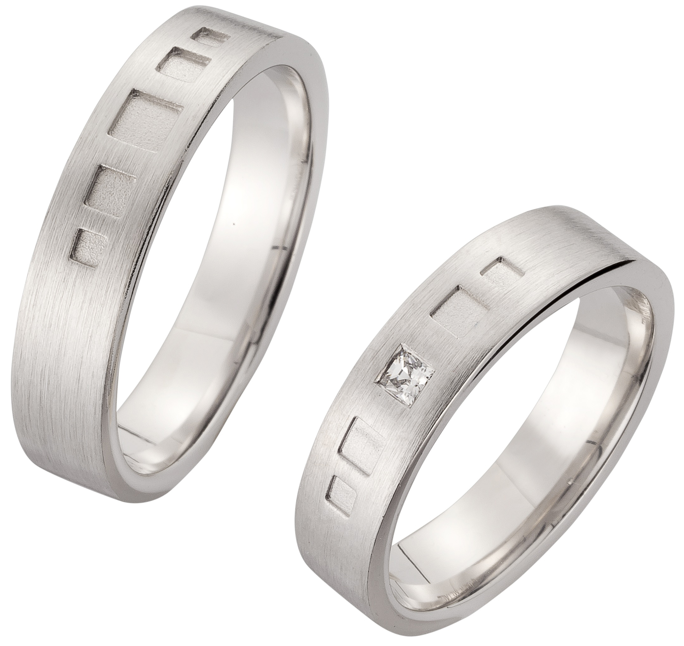 Der einfarbige TRAURINGWUNDER-Ring TWSR 52, Weißgold in feinmatt längs mit 5 Vertiefungen in Viereck- Form, hat eine Breite von 5mm und eine Höhe von 1,7mm. Der wunderschöne Damenring besticht durch 1 Princess Brillant im mittleren Viereck gefasst mit einer Gesamtsteingröße von 0,006 carat in der Qualität TW/SI. Die Ringe sind innen leicht bombiert und außen gerade. Probieren Sie unser Modell TWSR 52 bei einem TRAURINGWUNDER-Partner vor Ort oder bestellen Sie die Ringe hier im Shop. Unsere Hotline steht Ihnen bei Fragen und für Beratung gerne zur Verfügung.