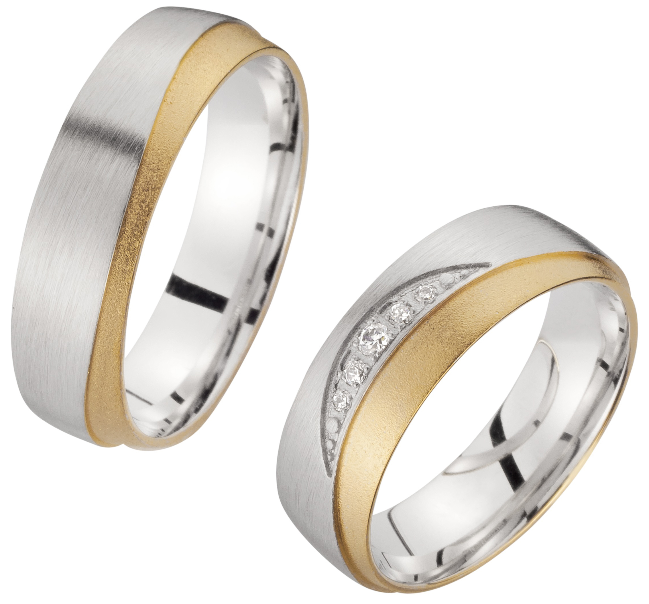 Der mehrfarbige TRAURINGWUNDER-Ring TWSR 17, Weißgold feinmatt längs mit einem geschwungenen unterstuften Rand um den Ring in Gelbgold sandmatt, hat eine Breite von 6mm und eine Höhe von 1,7mm. Der wunderschöne Damenring besticht durch 5 Brillanten halbrund im Verschnitt auf dem Weißgold, an der obergestuften Fläche gefasst mit einer Gesamtsteingröße von 0,05 carat in der Qualität TW/SI. Die Ringe sind innen und außen bombiert. Probieren Sie unser Modell TWSR 17 bei einem TRAURINGWUNDER-Partner vor Ort oder bestellen Sie die Ringe hier im Shop. Unsere Hotline steht Ihnen bei Fragen und für Beratung gerne zur Verfügung.